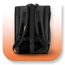 Háta kényelmesen párnázott, és a két függőleges párnázás között a levegő is tud járni. A táska fogóját bukósisak rögzítésére is lehet használni.