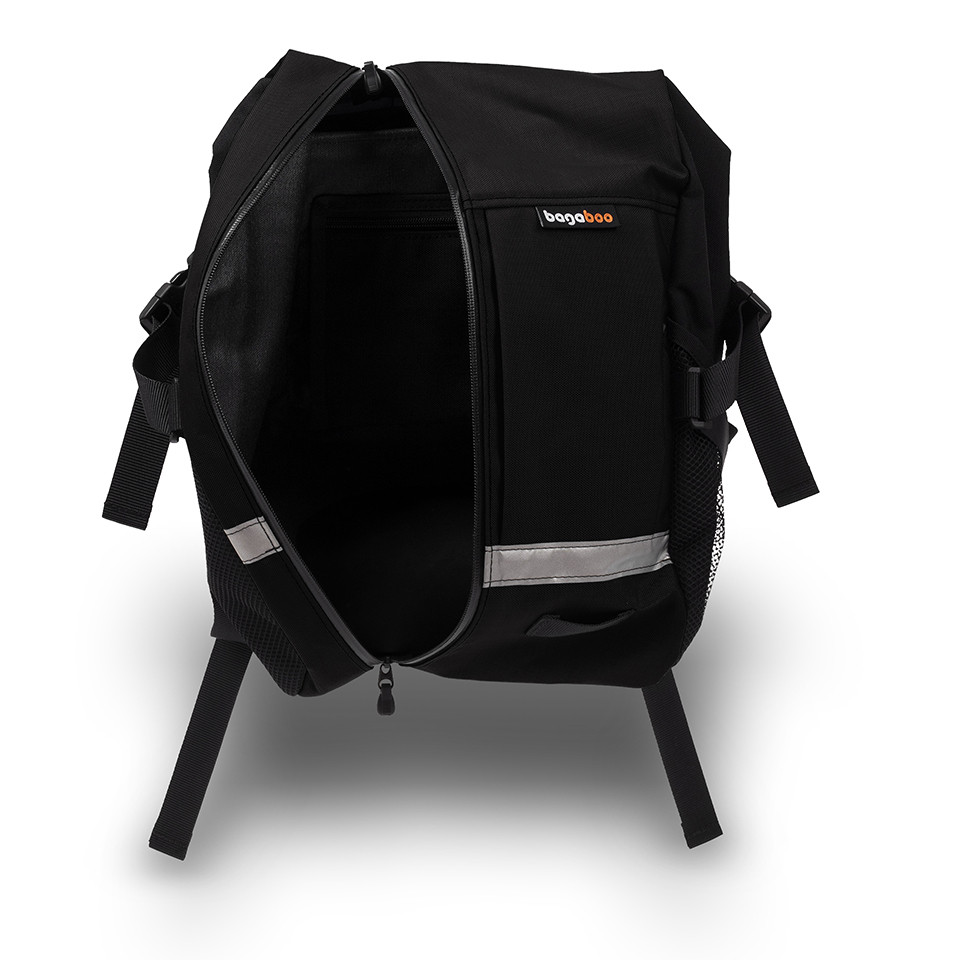 Fényvisszaverő csíkot és lámpatartót találsz a táska elején, és a vízlepergetős cipzárral teljesen kinyithatod az aljától a tetejéig, így könnyen hozzáférsz a belsejében lévő dolgokhoz.